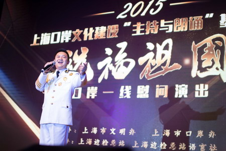 9月15日,上海口岸文化建设“主持与朗诵”基地交流暨“祝福祖国”口岸一线慰问演出活动在浦东机场边检站举行。上海同创共建文明口岸活动领导小组副组长、市文明办副主任宋慧出席活动并致辞,市口岸办副巡视员武伟,以及浦东机场海关、机场检验检疫局负责人、文明口岸活动办公室成员、浦东机场口岸基层一线工作者代表、各口岸文化艺术交流基地骨干等230多人观看了演出。上海边检总站副总站长邹志峰致欢迎辞。
