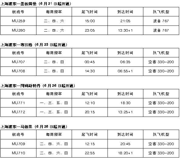 东航6月起新开上海浦东—圣彼得堡、上海浦东—布拉格、上海浦东—阿姆斯特丹、上海浦东—马德里四条国际航线。在现有伦敦、巴黎、法兰克福、罗马、莫斯科航点的基础上,东航欧洲远程通航点增加到九个。