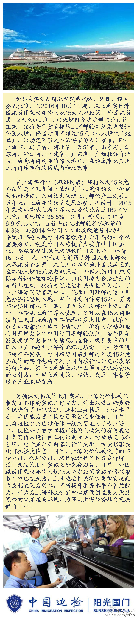 经国务院批准,自2016年10月1日起,在上海实行外国旅游团乘坐邮轮入境15天免签政策。外国旅游团(2人及以上)可由我境内合法注册的旅行社组织、接待并负责安排从上海邮轮口岸免办签证整团入境,停留时间不超过15天。