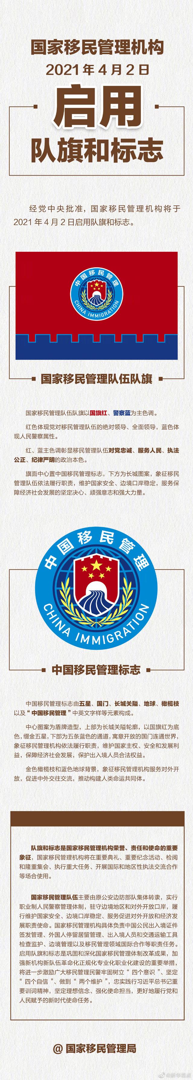 经党中央批准,国家移民管理机构将于2021年4月2日启用队旗和标志。国家移民管理队伍队旗以国旗红、警察蓝为主色调,中国移民管理标志由五星、国门、长城关隘、地球、橄榄枝以及“中国移民管理”中英文字样等元素构成。队旗和标志是国家移民管理机构荣誉、责任和使命的重要象征,国家移民管理机构将在重要典礼、重要纪念活动、检阅和隆重集会、执行重大任务、开展国际和地区性执法交流合作等场合使用。
