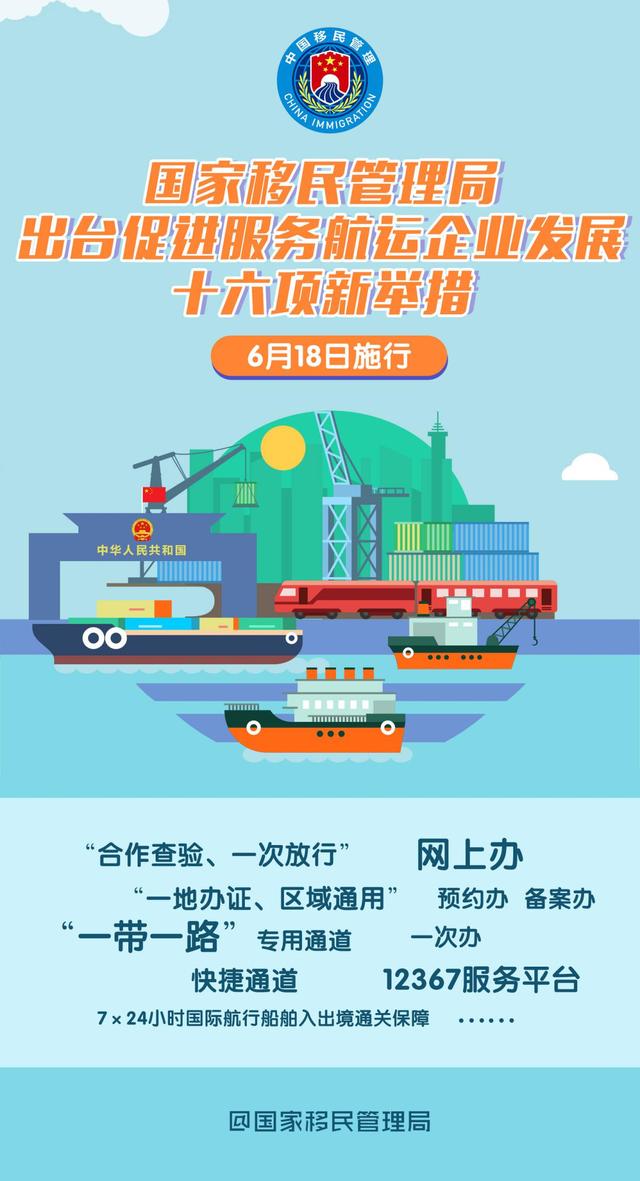 国家移民管理局今天(18日)出台促进服务航运企业发展十六项新举措,并从今日起施行,进一步优化口岸营商环境,激活市场主体活力。