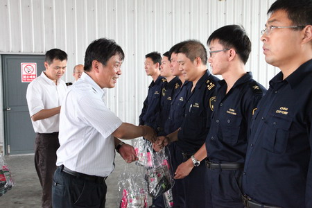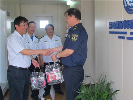8月25日,市口岸办施金根副主任赴洋山口岸高温慰问查验单位坚守在一线的执法人员。施金根副主任先后深入洋山海事局执法支队、洋山边检站边检2队现场办公地点,洋山海关、洋山检验检疫局在口岸查验区的查验平台,看望了现场一线执法人员,为他们送去了高温慰问品。施金根副主任还与陪同慰问的各查验单位领导就近期重点工作进行了交流。