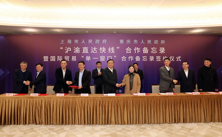 1月15日,“沪渝直达快线”合作备忘录暨国际贸易“单一窗口”合作备忘录签约仪式在市政府第1贵宾室举行。上海市副市长许昆林、重庆市委常委、常务副市长吴存荣出席签约仪式。市商务委(口岸办)、市交通委、上海海关、上海海事局、上港集团与重庆市政府口岸物流办等9家单位共同签署《关于支持开行“沪渝直达快线” 共同提升跨境贸易便利化水平合作备忘录》。